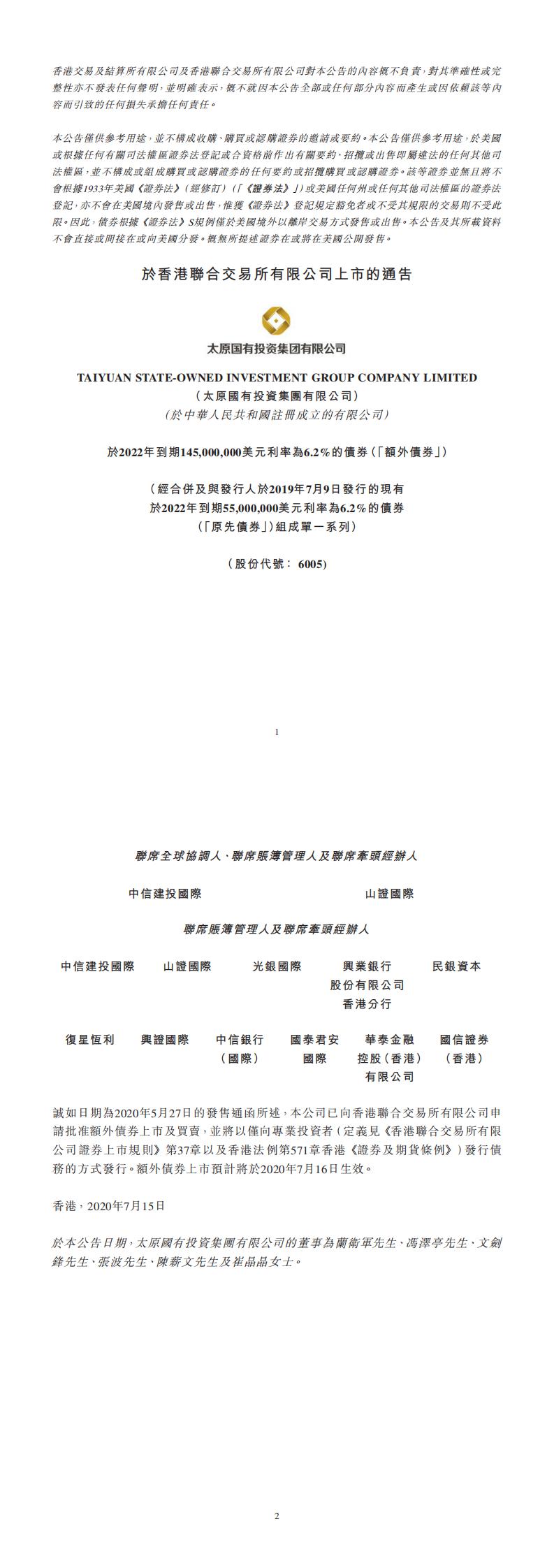 有關(guān)在香港聯(lián)合交易所有限公司上市的通知 — 太原國有投資集團有限公司 — 發(fā)行於二零二二年到期金額為145,000,000美元的6.2%債券