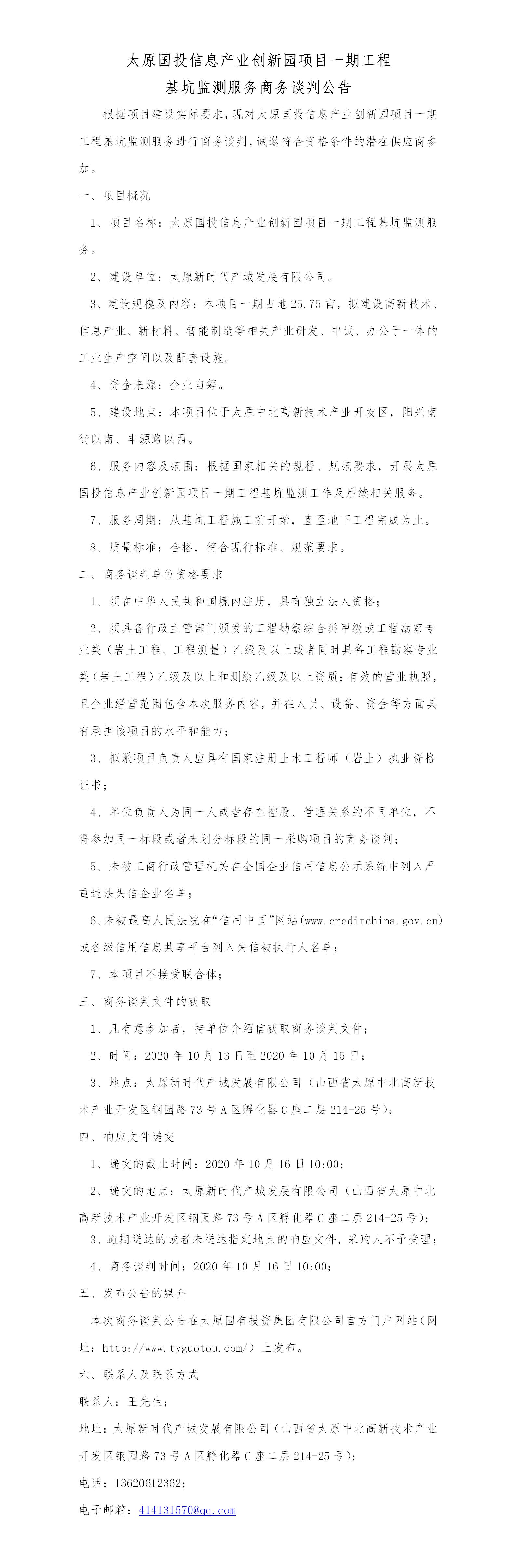 太原國投信息產業創新園項目一期工程基坑監測服務商務談判公告