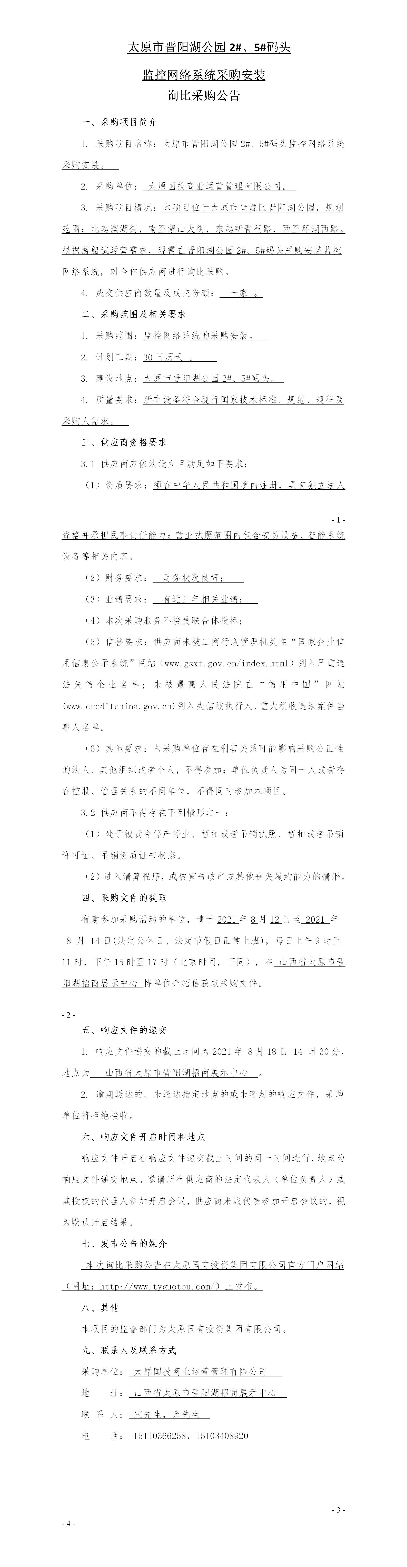 太原市晉陽湖公園2#、5#碼頭監控網絡系統采購 公告