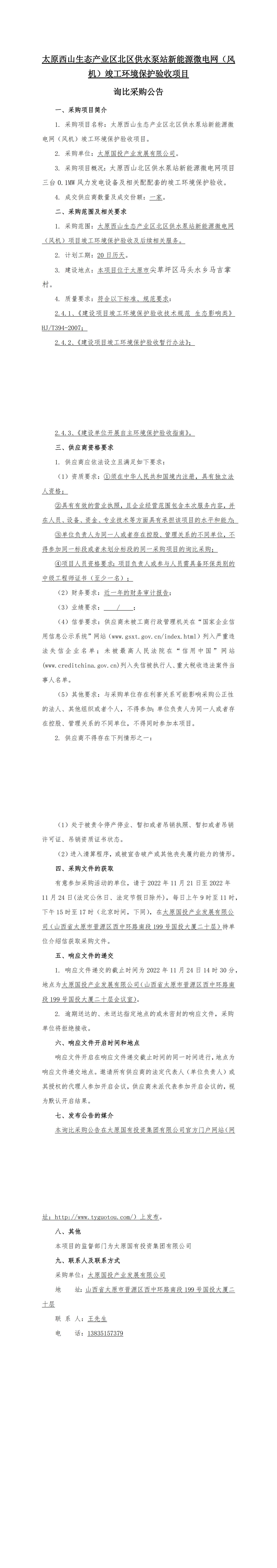太原西山生態產業區北區供水泵站新能源微電網(風機)竣工環境保護驗收詢比采購公告