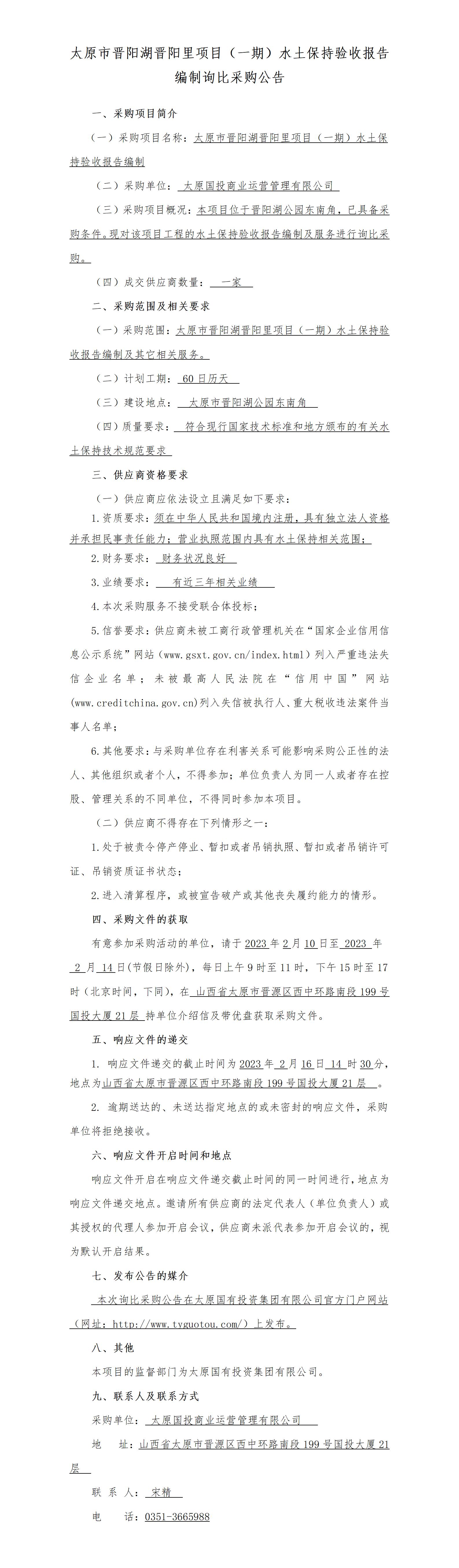 太原市晉陽湖晉陽里項目(一期)水土保持驗收報告編制詢比采購公告
