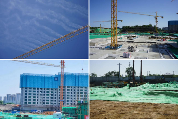 綠色的苫蓋網將裸漏的黃土牢牢覆蓋,最大程度的預防揚塵污染。塔吊高空噴淋系統(tǒng)以及圍擋噴淋系統(tǒng)智能、有效、精準的進行工地揚塵控制,空氣中的水霧可以將飄浮在空氣中的污染顆粒物、塵埃等迅速逼降地面,達到清潔凈化空氣的效果。正在建設的樓棟外墻窗洞口被防塵網包裹,以一定幾何形狀、開孔率和不同孔形組合擋風抑塵墻,使流通的空氣從外通過墻體時,在墻體內側形成上、下干擾的氣流以達到外側強風,內側弱風,外側小風,內側無風的效果,防止粉塵的飛揚。