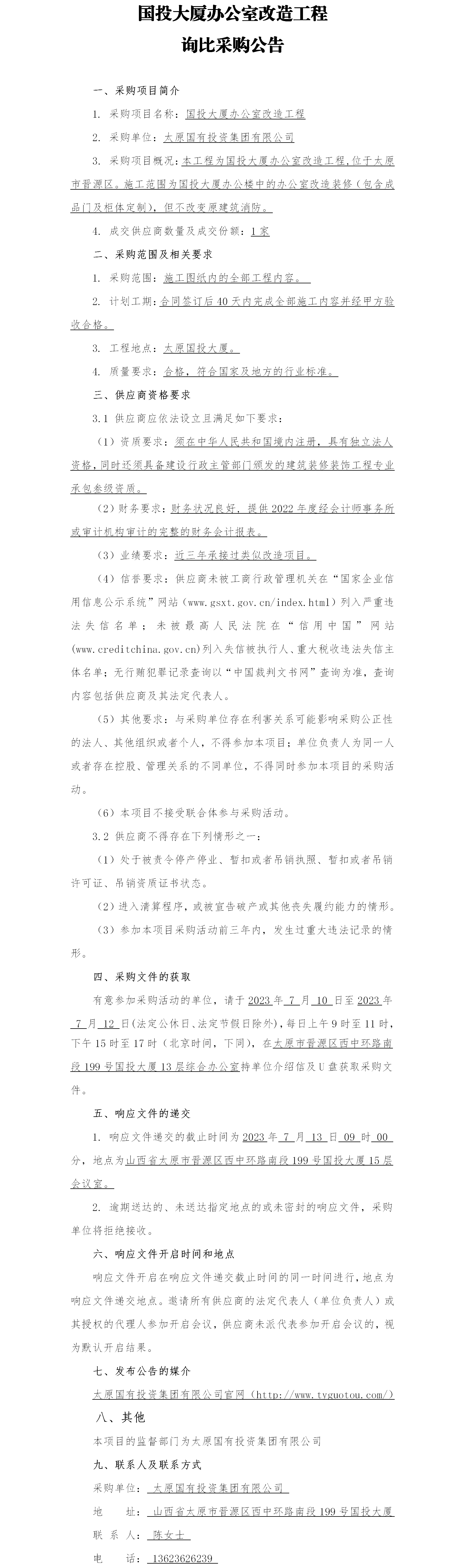國投大廈辦公室改造工程詢比采購公告