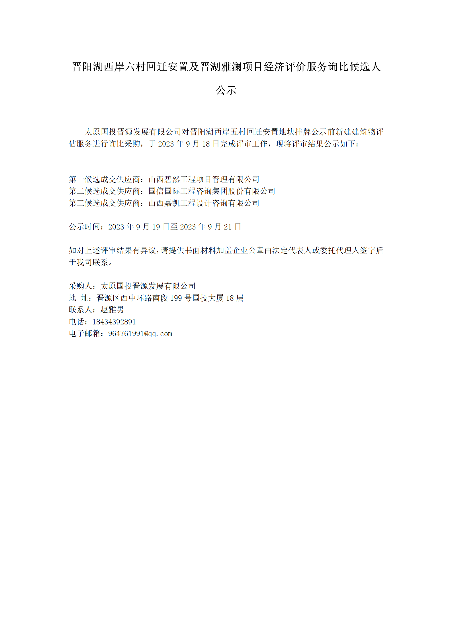 晉陽湖西岸六村回遷安置及晉湖雅瀾項目經濟評價服務詢比候選人公示