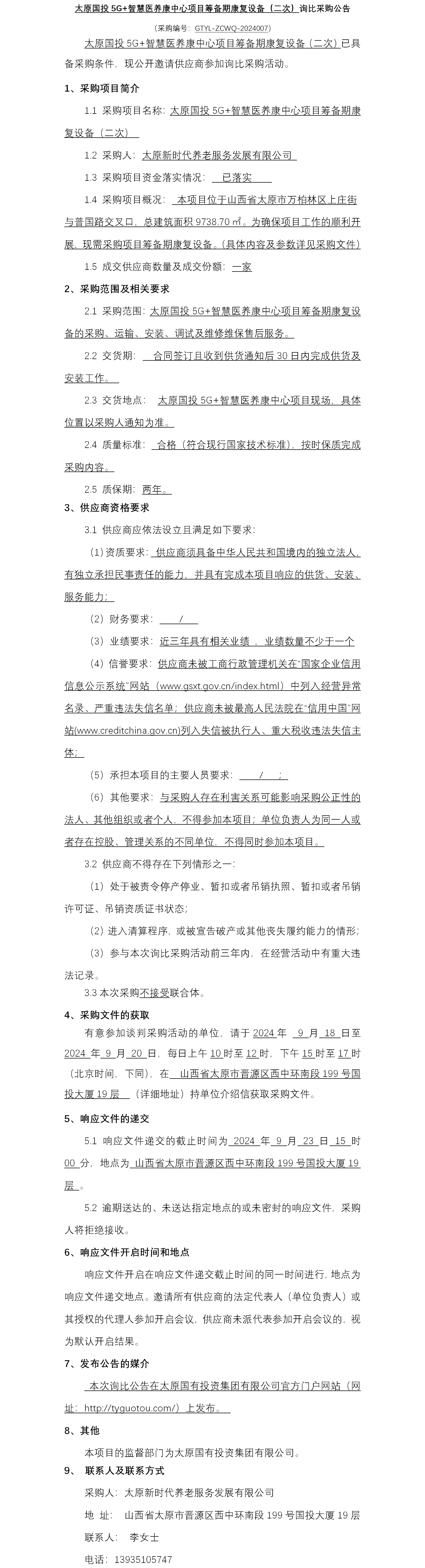 太原國投5G+智慧醫養康中心項目籌備期康復設備(二次)詢比采購公告